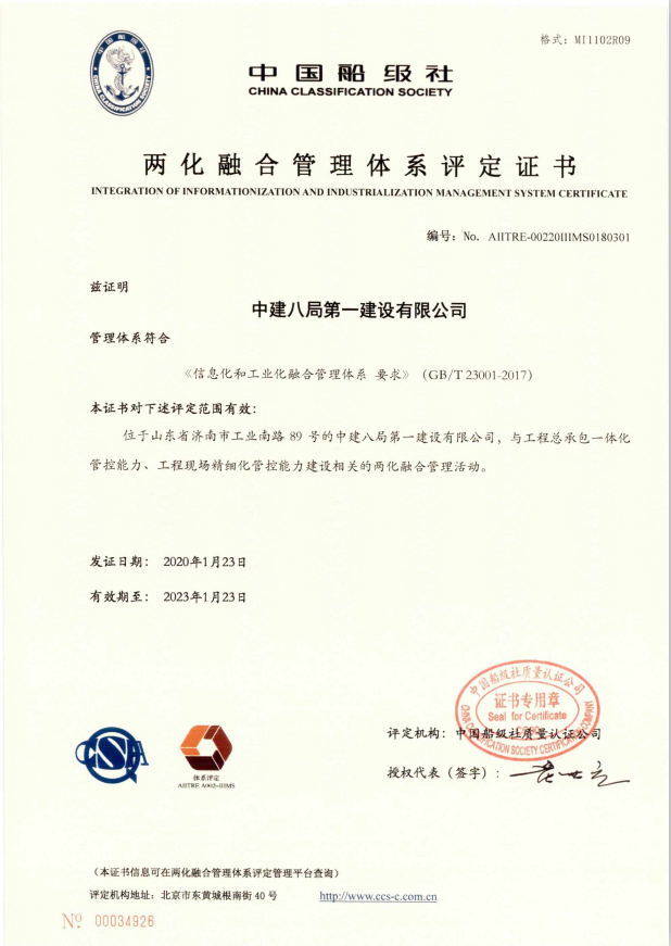 近日,中建八局一公司兩化融合管理體系通過工信部審核并公示,順利取得中國船級社頒發(fā)的《兩化融合管理體系評定證書》,評定范圍包含:工程總承包一體化管控能力、工程現(xiàn)場精細(xì)化管控能力建設(shè)相關(guān)的兩化融合管理能力。這標(biāo)志著其成為山東省首家獲得此項權(quán)威認(rèn)證的建筑企業(yè),也是中建集團(tuán)系統(tǒng)首家獲得此項認(rèn)證的施工總承包企業(yè)。