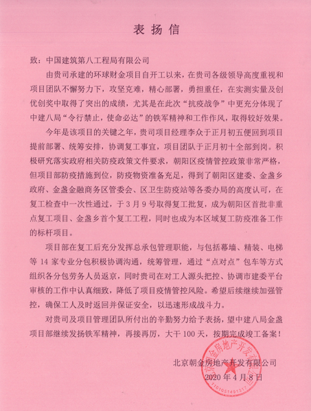 4月9日,北京金盞項目喜獲業(yè)主單位招商局地產(chǎn)發(fā)來的表揚信,信中對項目部在實測實量及創(chuàng)優(yōu)創(chuàng)獎中取得的突出成績,在“抗疫戰(zhàn)爭”中防控工作、組織復工等方面的工作給予高度評價。