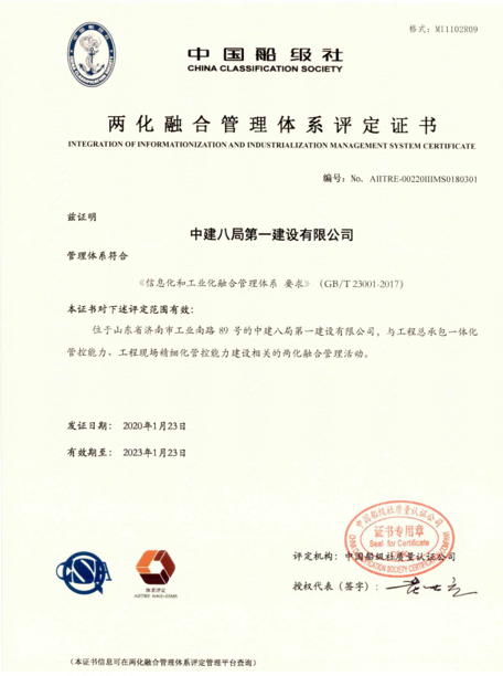 近日,中建八局一公司兩化融合管理體系通過工信部審核并公示,順利取得中國船級(jí)社頒發(fā)的《兩化融合管理體系評(píng)定證書》,評(píng)定范圍包含:工程總承包一體化管控能力、工程現(xiàn)場精細(xì)化管控能力建設(shè)相關(guān)的兩化融合管理能力。