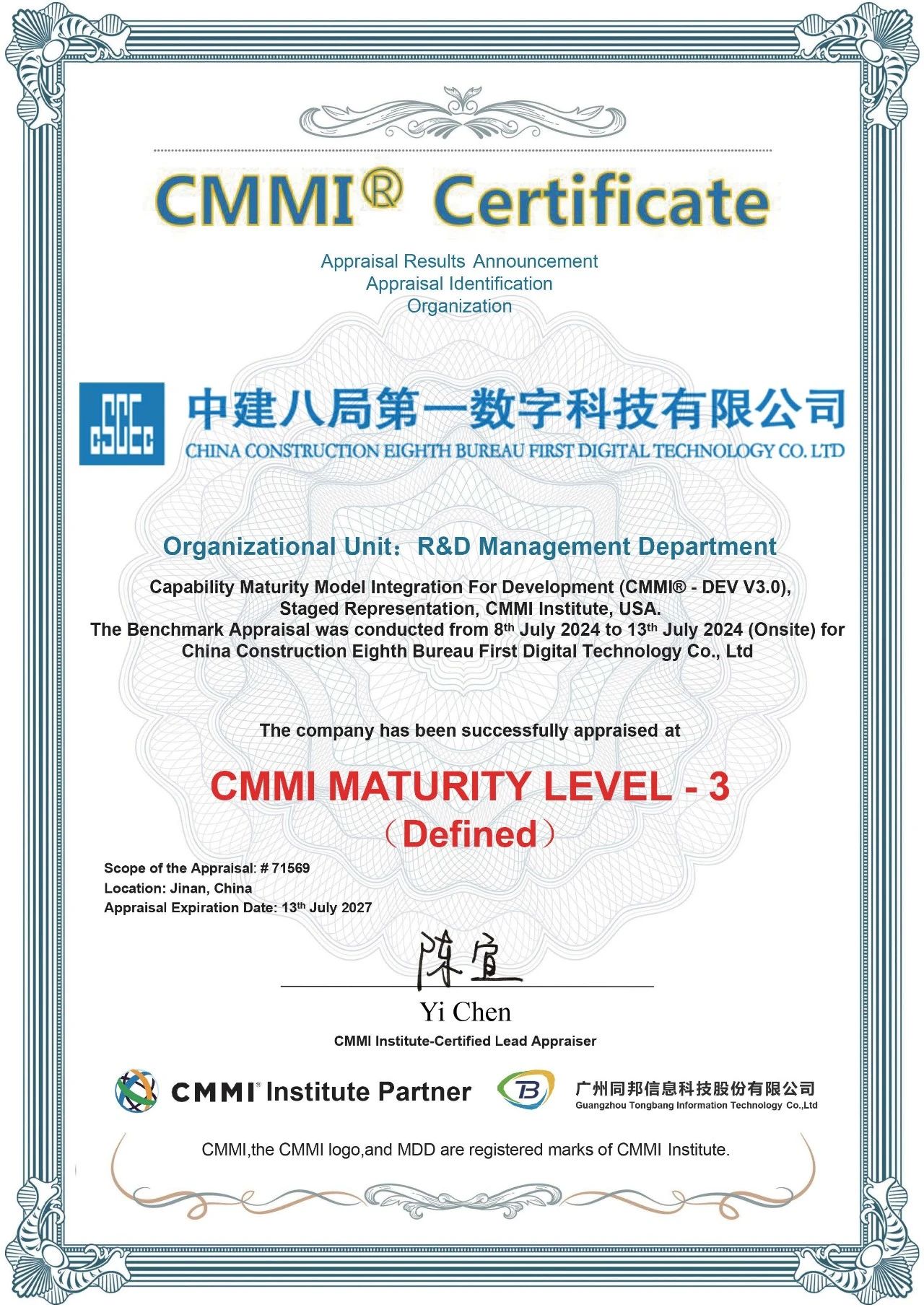 中建八局第一數(shù)字科技有限公司通過CMMI-3級認證
