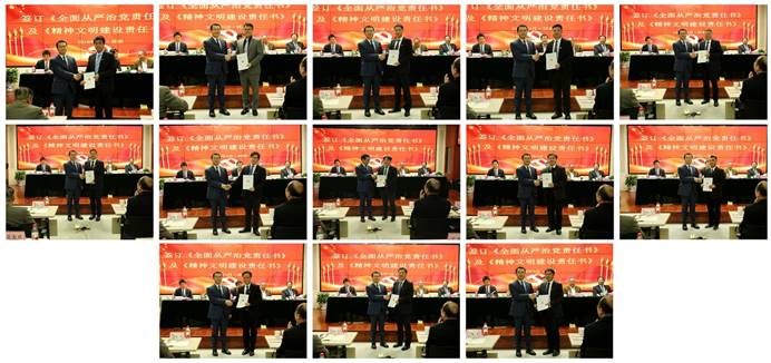 會上,濟南公司、華南公司、中原公司、裝飾公司四家二級單位書記作了工作述職。公司黨委書記、董事長董文祥代表公司黨委與13家二級單位簽訂并發(fā)放了《全面從嚴治黨責任書》、《精神文明建設責任書》。