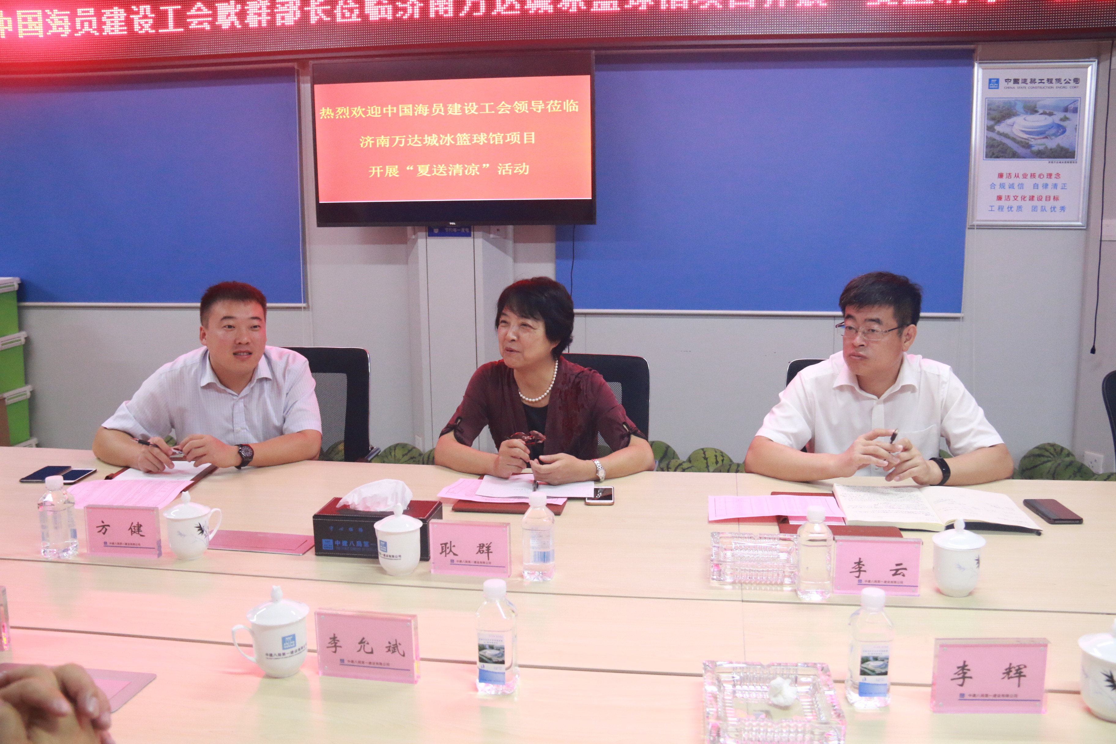 8月14日上午,中國(guó)海員建設(shè)工會(huì)建筑工作部部長(zhǎng)耿群蒞臨濟(jì)南萬(wàn)達(dá)城冰籃館項(xiàng)目開(kāi)展工會(huì)工作調(diào)研暨“夏送清涼”活動(dòng),公司黨委副書記、工會(huì)主席李云,助理總經(jīng)理李允斌,工會(huì)工作部負(fù)責(zé)人方健,濟(jì)南公司黨委書記、工會(huì)主席畢延寶,濟(jì)南公司副總經(jīng)理李輝等陪同調(diào)研。