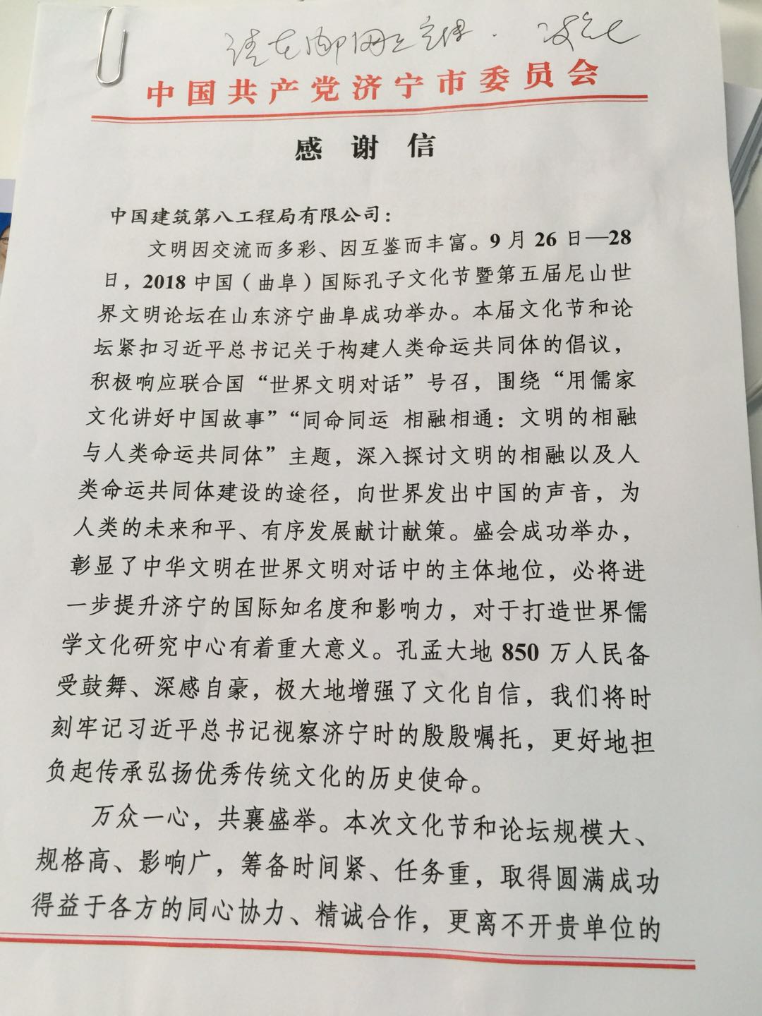 感謝信中表示“萬(wàn)眾一心,共襄盛舉。本次文化節(jié)和論壇規(guī)模大、規(guī)格高、影響廣,籌備時(shí)間緊、任務(wù)重,取得圓滿成功得益于各方的同心協(xié)力、精誠(chéng)合作,更離不開(kāi)貴單位的鼎力支持。中共濟(jì)寧市、濟(jì)寧市政府,向貴單位表示衷心的感謝和崇高的敬意!”