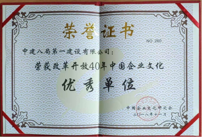 “改革開放40年中國企業(yè)文化優(yōu)秀單位”獎狀