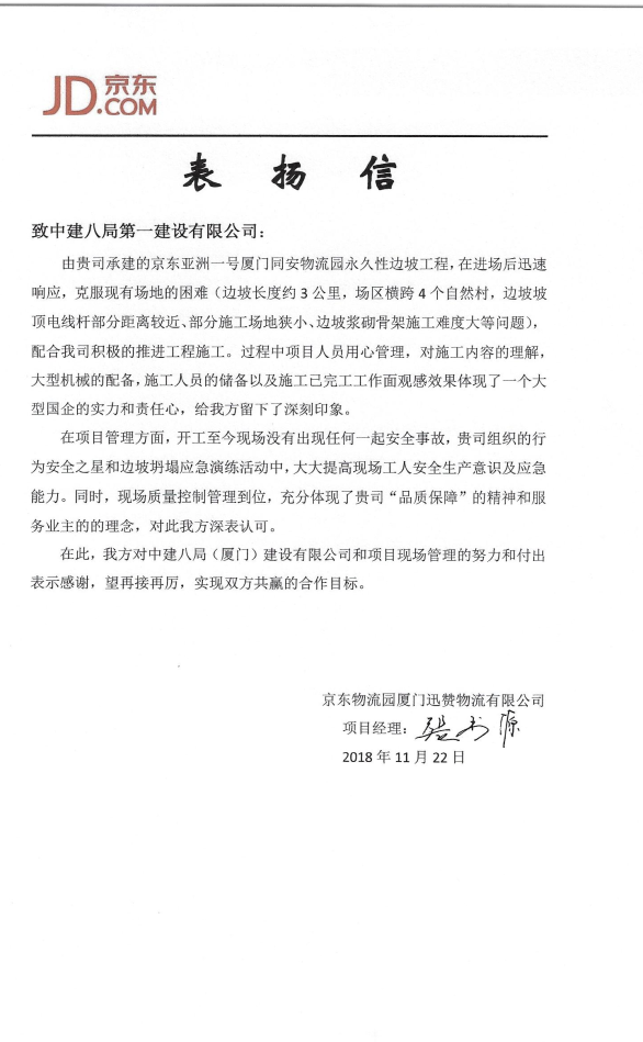 廈門(mén)京東物流園項(xiàng)目喜獲業(yè)主表?yè)P(yáng)信