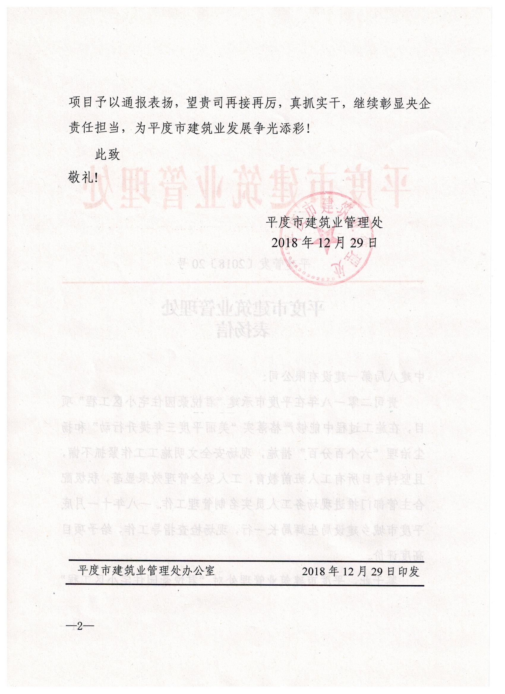 項目自二零一八年開工以來,于一八年十月份順利完成業(yè)主預售節(jié)點任務,配合業(yè)主單位年前圓滿開盤,而且嚴格落實政府主管部門的各項工作要求,項目各項具體工作均切實有效開展,受到平度市城鄉(xiāng)建設局的肯定與表揚。