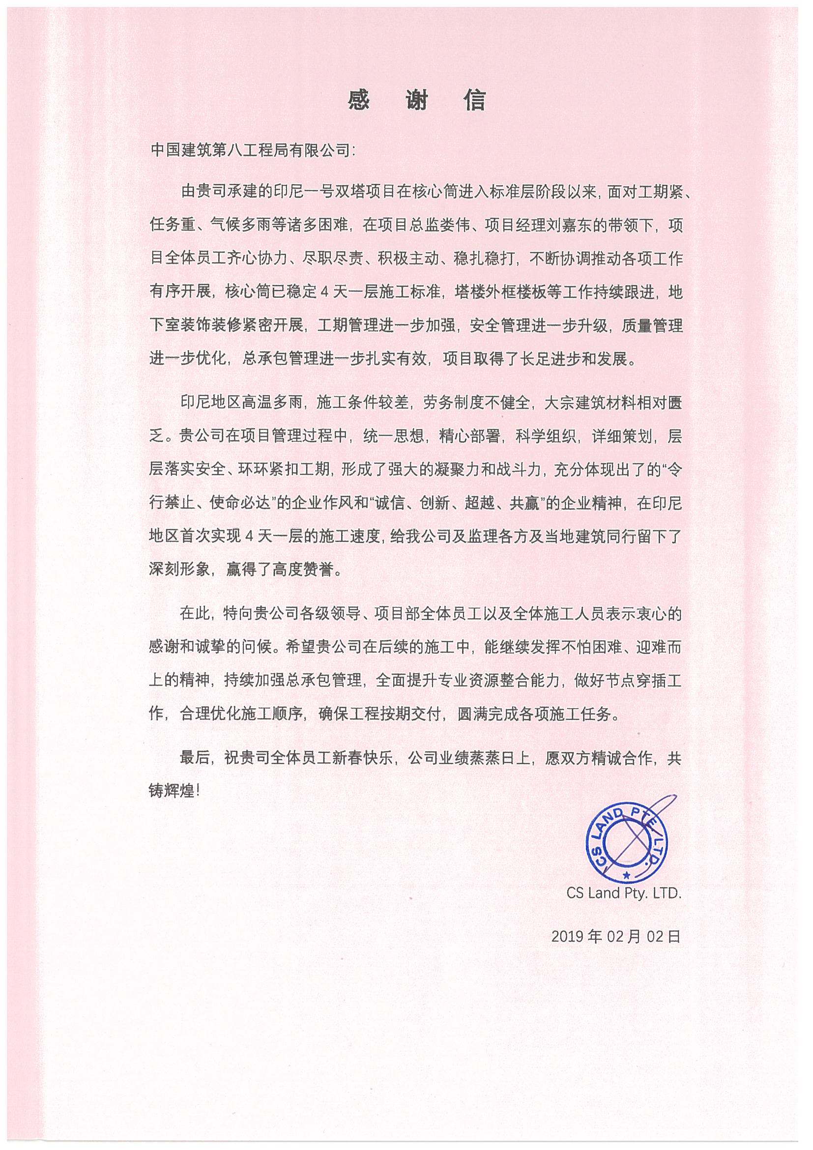 近日,印尼一號雙塔項目收到來自業(yè)主安中國際石油集團的表揚信。信中高度贊揚了項目管理團隊“令行禁止、使命必達”的企業(yè)作風和“誠信、創(chuàng)新、超越、共贏”的企業(yè)精神,對項目創(chuàng)造的核心筒結構4天一層的中建速度給予高度評價,對項目經理劉嘉東帶領的管理團隊所付出的努力與取得的成績表示衷心感謝。