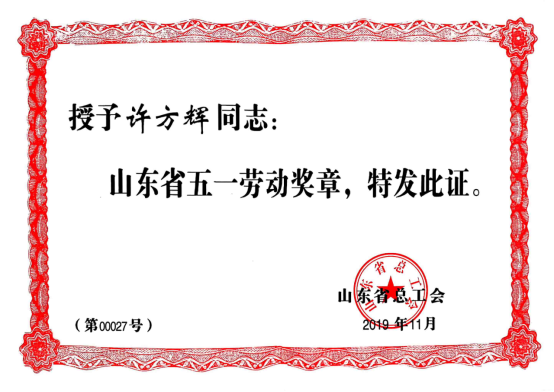 許方輝榮獲山東省五一勞動獎?wù)?/font>