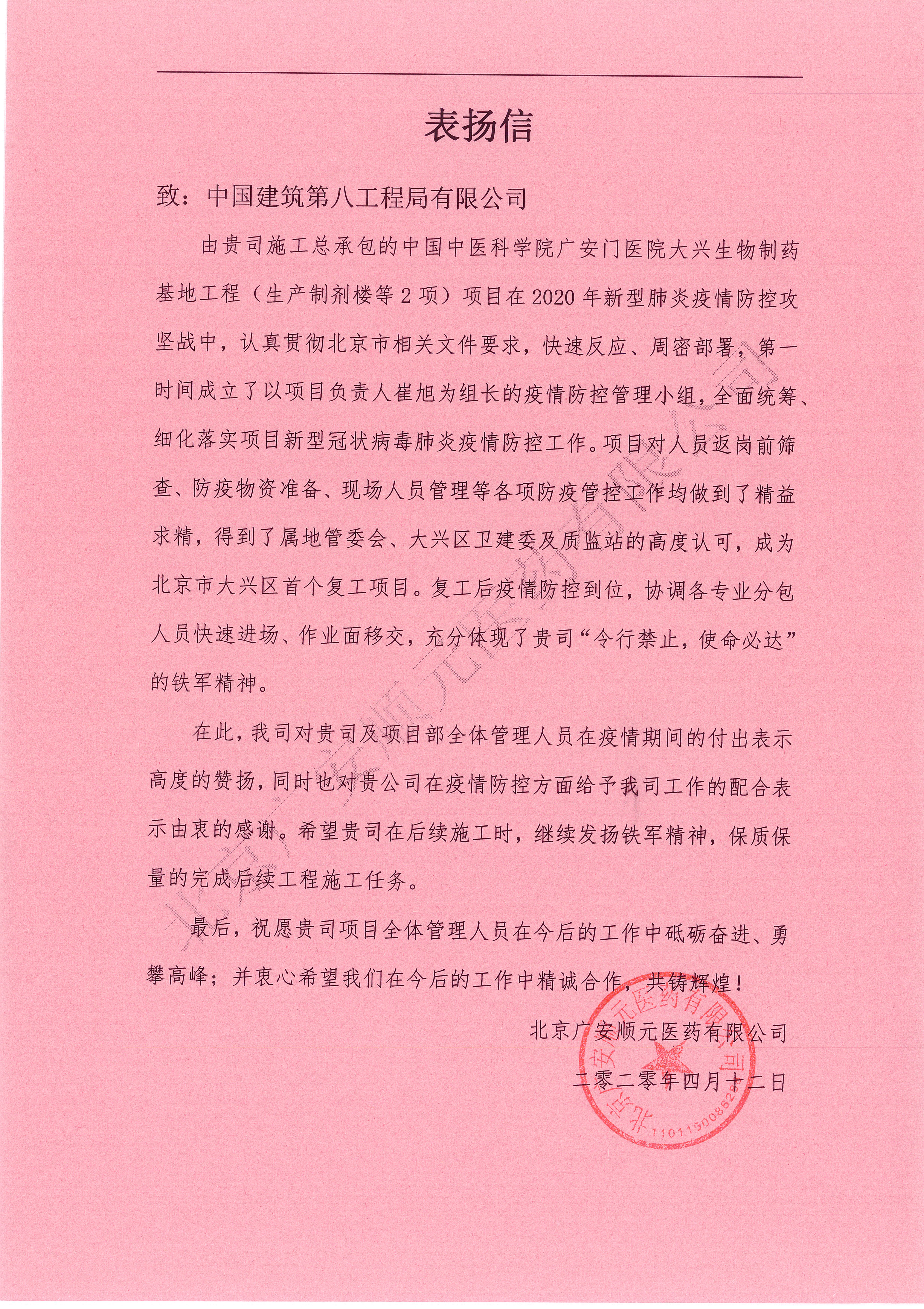 4月12日,中國中醫(yī)科學(xué)院廣安門醫(yī)院項目部喜獲業(yè)主單位北京廣安順元醫(yī)藥有限公司發(fā)來的表揚信,業(yè)主單位對項目部在在疫情期間防控工作、組織復(fù)工等方面的展現(xiàn)出來的“令行禁止 使命必達”的鐵軍精神表示高度的認可。