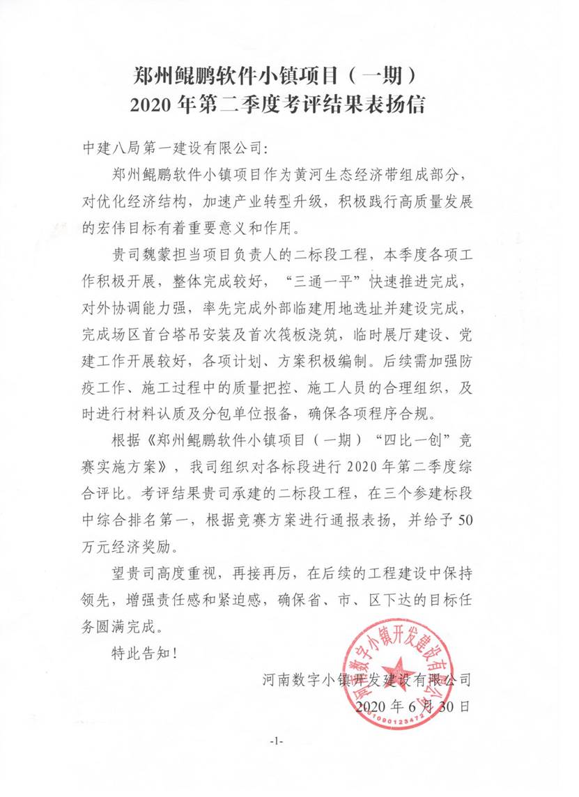近日,鄭東新區(qū)科學谷數(shù)字小鎮(zhèn)建設(shè)項目在建設(shè)單位組織的第二季度“四比一創(chuàng)”勞動競賽綜合評比中綜合排名第一,再次收到業(yè)主單位表揚信并獲得50萬元獎勵。