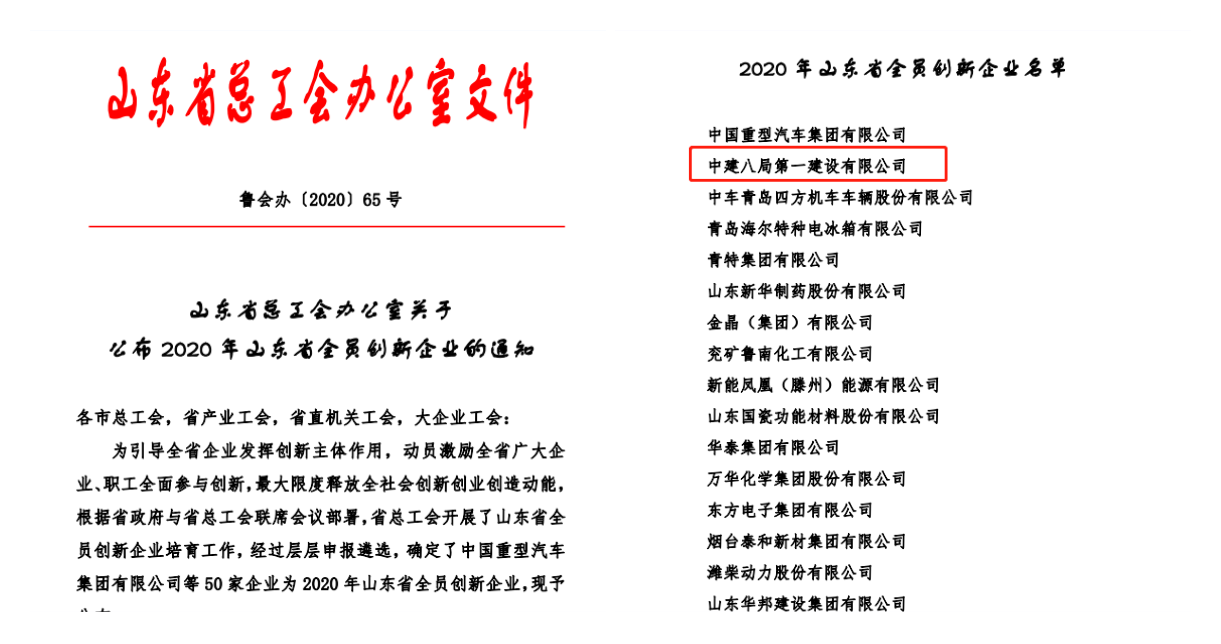 近日,山東省總工會(huì)、濟(jì)南市總工會(huì)相繼發(fā)布《關(guān)于公布 2020 年山東省全員創(chuàng)新企業(yè)的通知》和《關(guān)于2020年度泉城職工全員創(chuàng)新競(jìng)賽獲獎(jiǎng)名單的通報(bào)》,公司共榮獲5項(xiàng)獎(jiǎng)項(xiàng)。分別是“山東省全員創(chuàng)新企業(yè)”、“濟(jì)南市全員創(chuàng)新企業(yè)”、“濟(jì)南市創(chuàng)新型班組(綠色產(chǎn)業(yè)園新型模架工廠班組)”、“濟(jì)南市創(chuàng)新能手(張軍)”、“濟(jì)南市職工優(yōu)秀技術(shù)成果”。