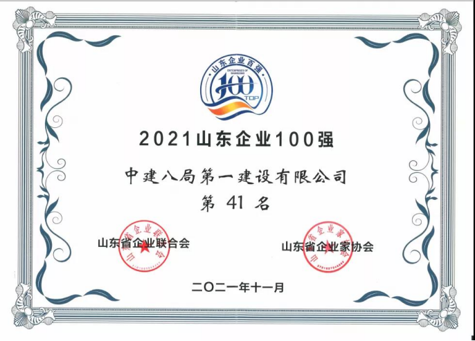 繼榮獲國資委“標(biāo)桿企業(yè)”、全國質(zhì)量獎組織獎等一系列重磅榮譽(yù)后,中建八一再度榮獲“2021年度山東省百強(qiáng)企業(yè)”,位列第41名。至此,公司已連續(xù)2年躋身山東省百強(qiáng)企業(yè)前50名!