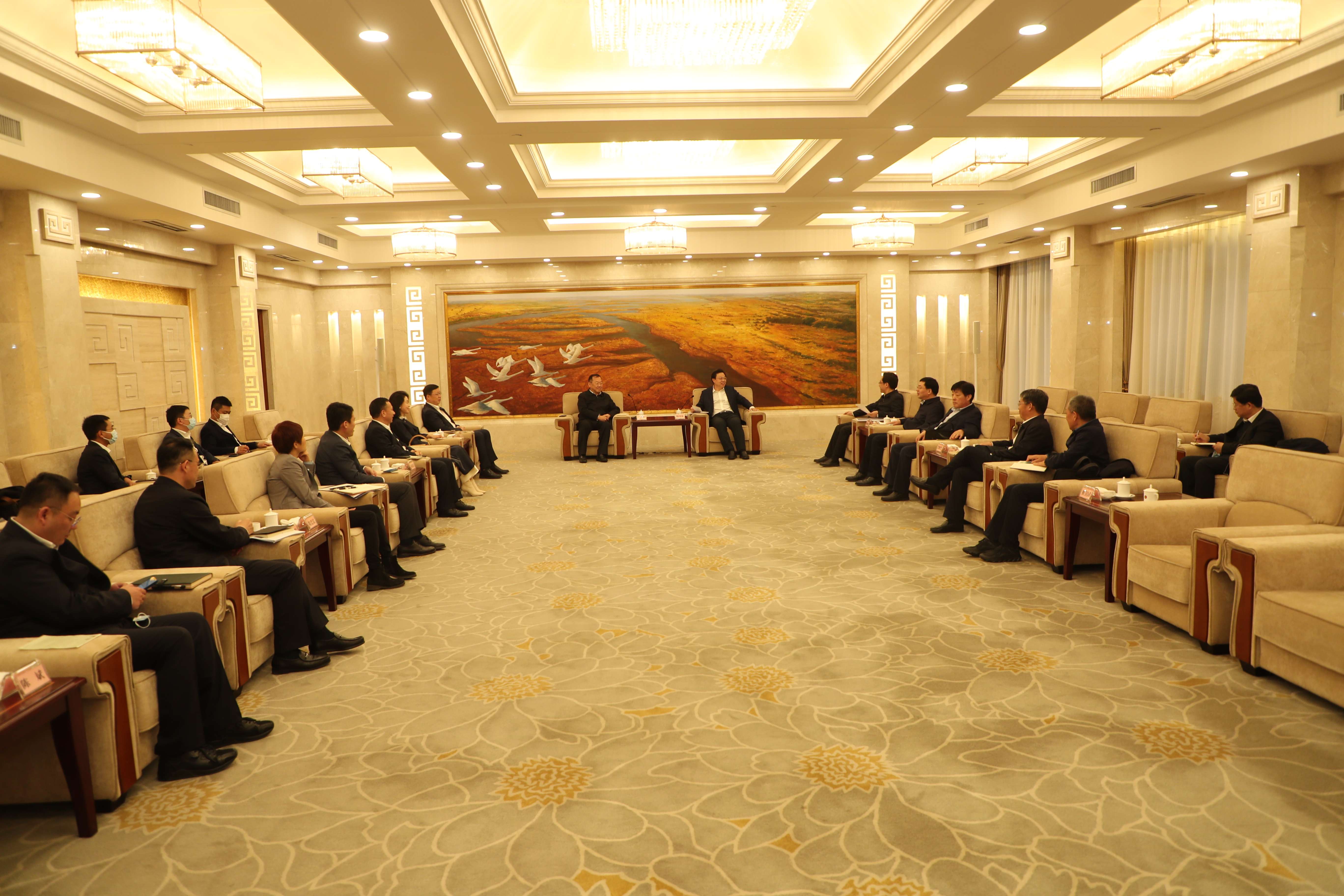 楊國強對章維成一行的到訪表示歡迎,并簡要介紹了東營市的經(jīng)濟發(fā)展情況和整體規(guī)劃。他表示,2022年是東營市深入貫徹習近平總書記視察東營重要指示要求,加快推進高水平現(xiàn)代化城市建設(shè)的關(guān)鍵之年。當前,東營市正圍繞黃河流域生態(tài)保護和高質(zhì)量發(fā)展重大戰(zhàn)略,打造優(yōu)良的發(fā)展空間和營商環(huán)境,助推城市建設(shè)和經(jīng)濟發(fā)展。中建八局作為國家建設(shè)領(lǐng)域的骨干企業(yè),綜合實力雄厚,品牌優(yōu)勢明顯,希望中建八局持續(xù)發(fā)揮全產(chǎn)業(yè)鏈優(yōu)勢,聚焦黃河流域生態(tài)保護和高質(zhì)量發(fā)展,積極參與東營發(fā)展建設(shè),在服務(wù)保障民生、基礎(chǔ)設(shè)施建設(shè)、文化旅游、城市更新等領(lǐng)域同東營深化合作,加快推動生態(tài)優(yōu)先綠色發(fā)展,為東營市打造山東高質(zhì)量發(fā)展增長極、建設(shè)富有活力的現(xiàn)代化濕地城市做出積極貢獻。
