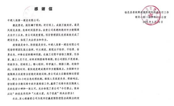 臨邑縣衛(wèi)生健康局發(fā)來(lái)感謝信,信中提到中建八一建設(shè)團(tuán)隊(duì)和后勤保障運(yùn)營(yíng)團(tuán)隊(duì)用實(shí)際行動(dòng)贏得良好口碑,充分體現(xiàn)出中建八一“令行禁止,使命必達(dá)”的優(yōu)良作風(fēng)和“大疫大愛(ài),先于抗疫”的央企擔(dān)當(dāng)。