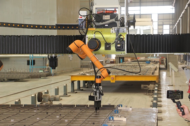 隨后,來到第六跨疊合板自動化流水生產(chǎn)線,寧文忠、李鐵軍共同為智能鋼筋綁扎機器人揭彩。該機器人是一種可視覺導(dǎo)引的六軸鋼筋綁扎機器人,安放在流水線的鋼筋綁扎區(qū)域,能夠高效精準(zhǔn)的進行鋼筋綁扎工作,具有自動識別,精準(zhǔn)高效、協(xié)同作業(yè)、一機雙控等特點,綁扎速度是人工的2倍,大大提高鋼筋綁扎效率。
