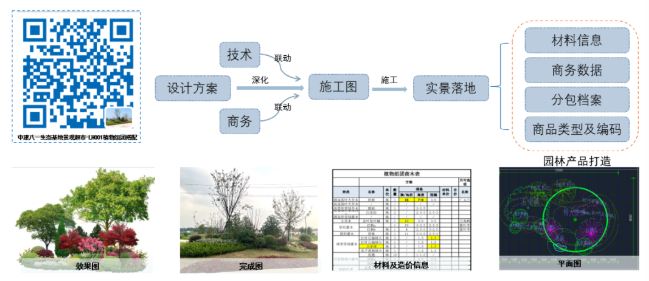 產(chǎn)品定制“身份號碼”,景觀“超市”自助結算,每一個商品都形成一個二維碼,分類編碼列入商品化圖冊,客戶根據(jù)意向選取產(chǎn)品,項目操作拼接完成后,施工圖、造價、集采渠道、分包商選項等同步實現(xiàn),更適配EPC模式的操作方式。