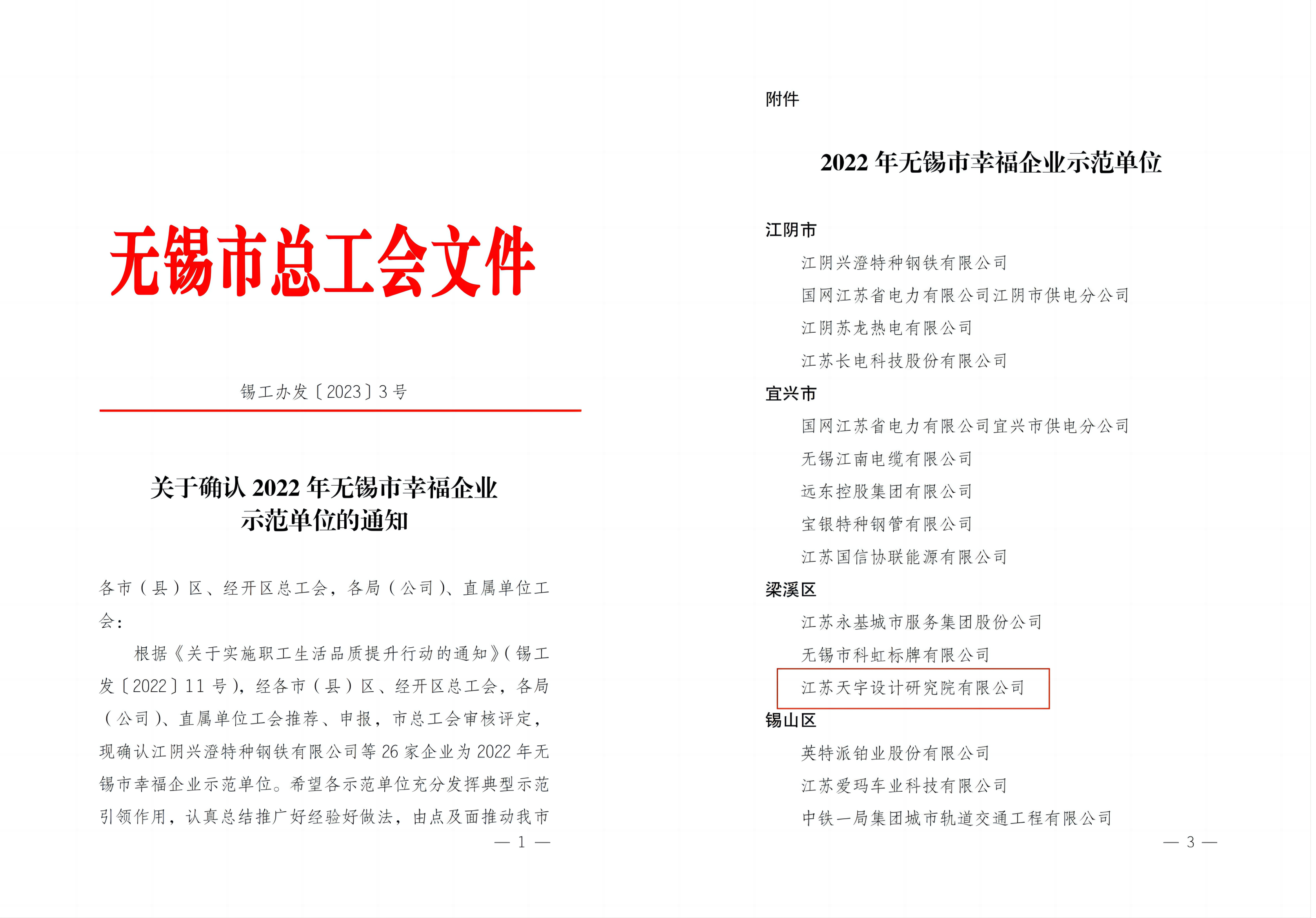 日前,無錫市總工會下發(fā)《關于確認2022年無錫市幸福企業(yè)示范單位的通知》,確認了全市26家工作較為出色、服務卓有成效的企業(yè)為幸福企業(yè)示范單位,江蘇天宇設計研究院有限公司榜上有名。