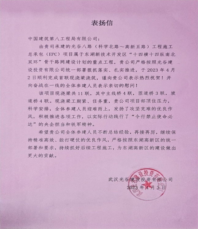近日,武漢光谷八路項目收到業(yè)主武漢光谷建設(shè)投資有限公司表揚(yáng)信一封。信中對項目順利完成首聯(lián)現(xiàn)澆澆筑表示祝賀,并向奮戰(zhàn)在一線的全體參建人員表示親切的慰問!