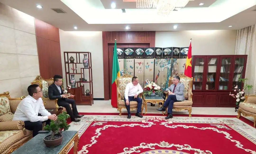 為加強與當?shù)氐穆?lián)系互動,調(diào)研期間,辛建龍一行前往中國駐貝寧大使館拜訪彭驚濤大使。