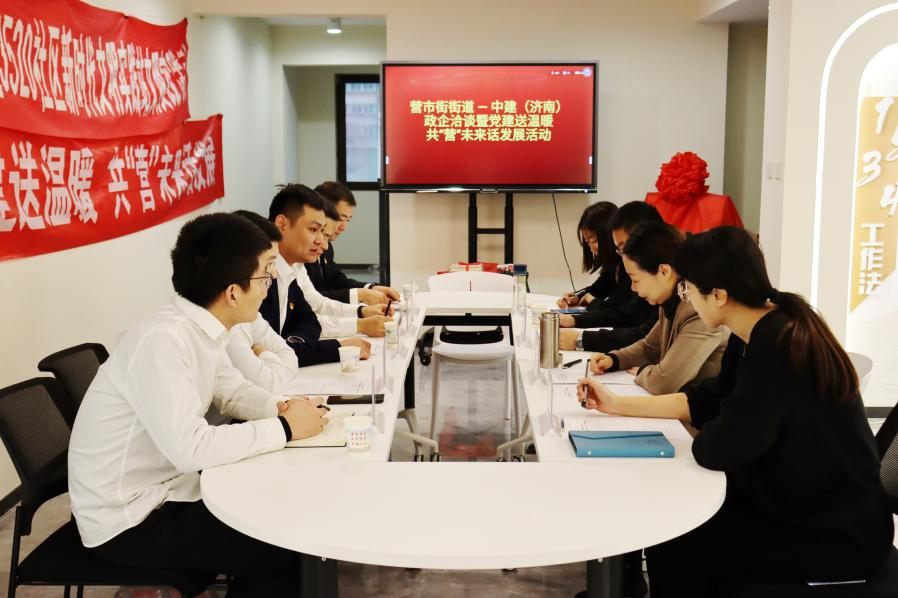 為推動(dòng)區(qū)域黨建互聯(lián)互動(dòng),提升基層黨組織的組織力、凝聚力和戰(zhàn)斗力,12月14日,濟(jì)南槐蔭營市街街道辦與濟(jì)南雨污分流項(xiàng)目黨支部與共同開展“政企洽談暨黨建聯(lián)建送溫暖 共“營”未來話發(fā)展”活動(dòng),營市街街道黨工委副書記、辦事處主任呂健,黨工委副書記、紀(jì)檢監(jiān)察工委書記、三級調(diào)研員胡慧敏,中建(濟(jì)南)投資建設(shè)有限公司辦公室主任楊恒,中建八局一公司濟(jì)南雨污分流項(xiàng)目黨支部書記辛建鑫、專職副書記余帥等參加活動(dòng)。