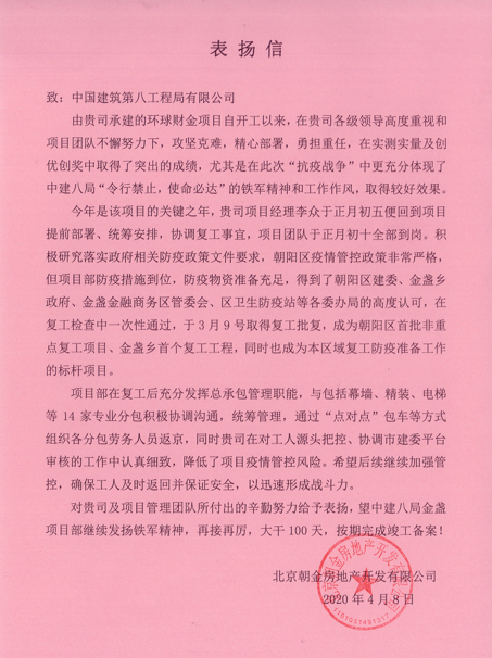 4月12日,中國中醫(yī)科學(xué)院廣安門醫(yī)院項(xiàng)目部喜獲業(yè)主單位北京廣安順元醫(yī)藥有限公司發(fā)來的表揚(yáng)信,業(yè)主單位對項(xiàng)目部在在疫情期間防控工作、組織復(fù)工等方面的展現(xiàn)出來的“令行禁止 使命必達(dá)”的鐵軍精神表示高度的認(rèn)可。