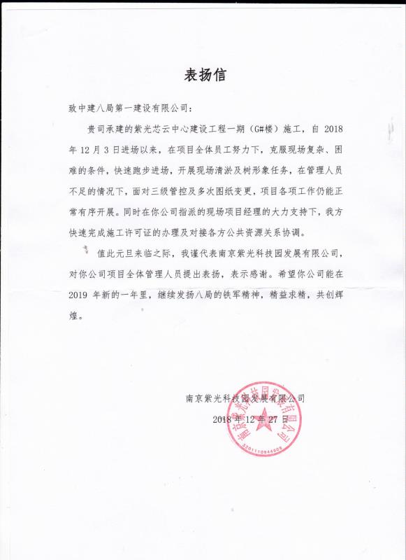 近日,南京紫光芯云中心建設工程一期G#樓項目,入場短短20天時間,喜獲業(yè)主單位表揚信。