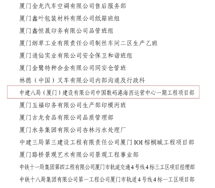 近日,廈門市總工會(huì)授予中建八局(廈門)建設(shè)有限公司中國(guó)數(shù)碼港海西運(yùn)營(yíng)中心一期工程項(xiàng)目部“廈門市工人先鋒號(hào)”稱號(hào)。