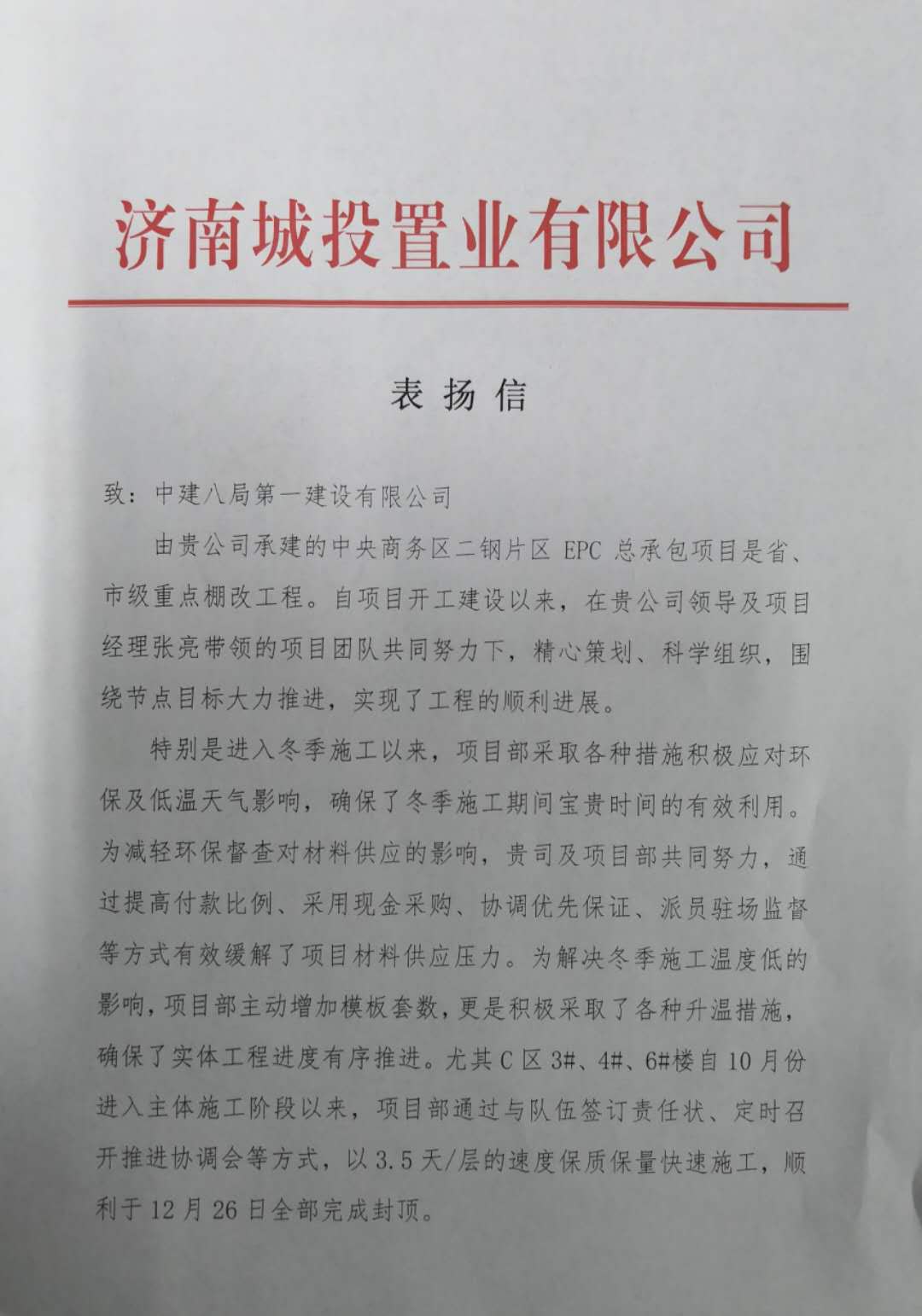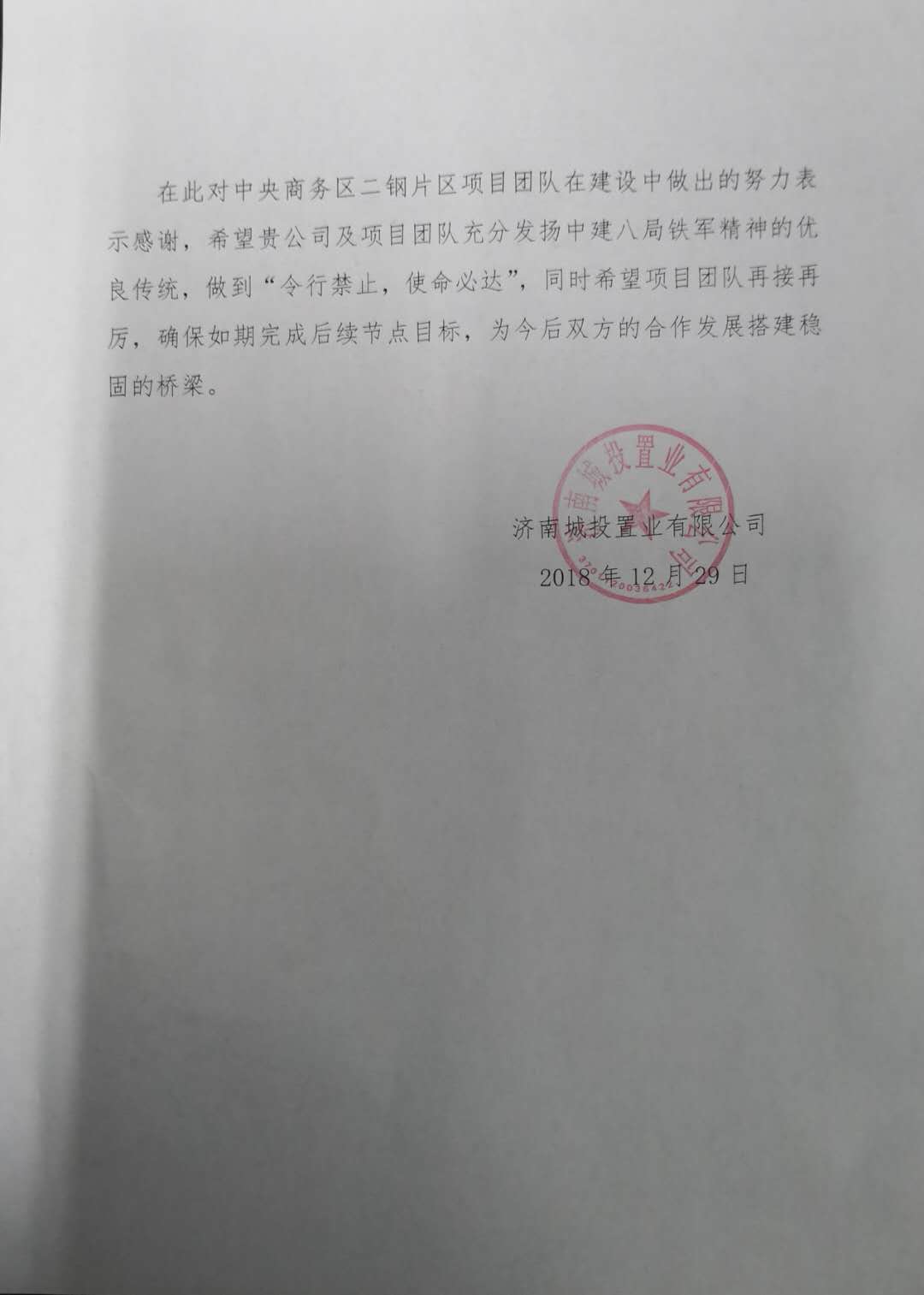 1月5日上午,中央商務(wù)區(qū)安置區(qū)項(xiàng)目收到濟(jì)南城投置業(yè)有限公司的表?yè)P(yáng)信。