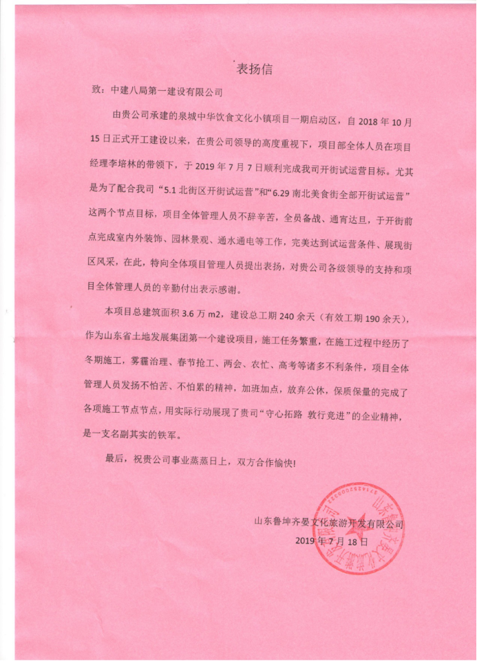 7月22日,泉城中華飲食文化小鎮(zhèn)項(xiàng)目收到山東魯坤齊晏文化旅游開(kāi)發(fā)有限公司對(duì)公司及項(xiàng)目部的表?yè)P(yáng)信。