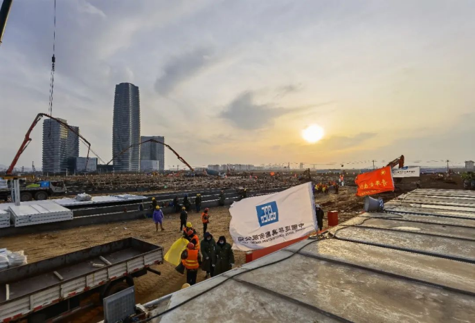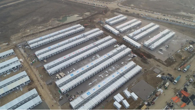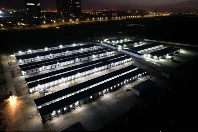 大干快上,全速推進(jìn)!現(xiàn)場120名管理人員,高峰時(shí)期1000余名工人,45臺(tái)大型機(jī)械設(shè)備,3小時(shí)完成建筑方案總平面圖,18小時(shí)完成全專業(yè)圖紙,36小時(shí)完成3.93萬平方米場地平整,48小時(shí)完成7萬余米機(jī)電管線安裝,72小時(shí)完成12萬土方回填,120小時(shí)完成9000方混凝土澆筑,60小時(shí)完成460間箱房主體框架搭設(shè),26日晚,460間箱式隔離房間全部亮燈。