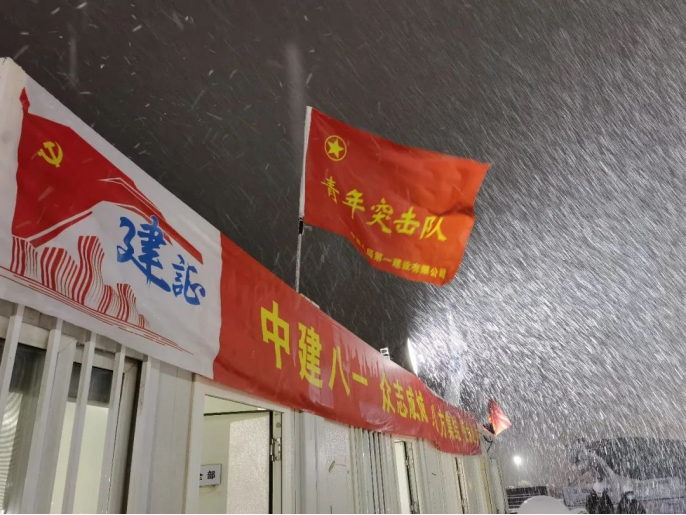 項(xiàng)目進(jìn)場后成立臨時(shí)黨支部,全體黨員在援建場區(qū)舉行宣誓儀式。3月18日晚,70余名突擊隊(duì)員頂風(fēng)冒雪,抗住緊張工期與惡劣天氣的雙重壓力,穩(wěn)步推進(jìn)現(xiàn)場建設(shè)。