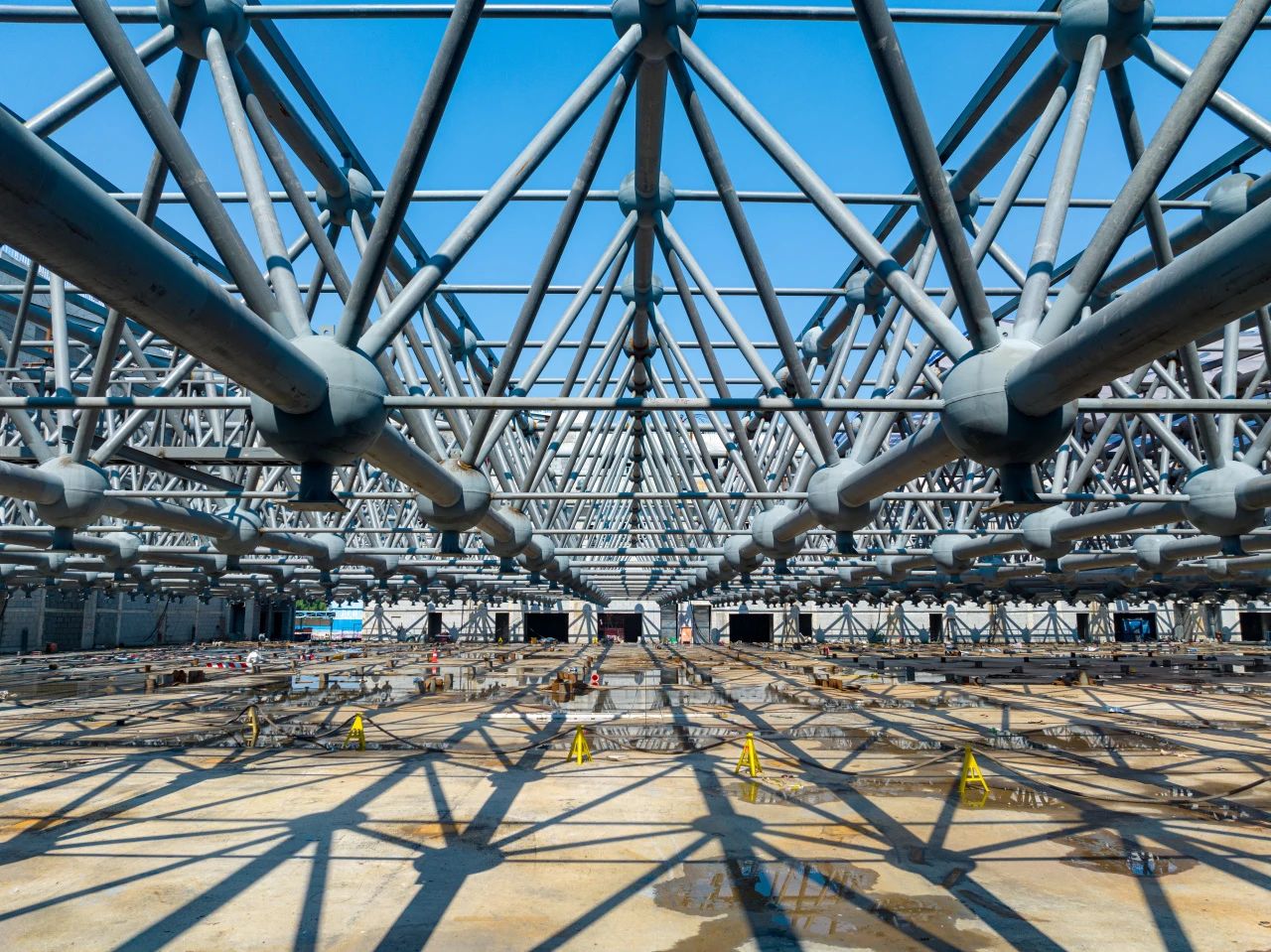 本次會(huì)展中心鋼網(wǎng)架采用正放四角錐焊接球網(wǎng)架通過46件球型支座支承于混凝土結(jié)構(gòu),涉及24種,共計(jì)1045個(gè)焊接球,桿件數(shù)量達(dá)到6000余件,鋼網(wǎng)架面積約為1萬平方米,相當(dāng)于23個(gè)標(biāo)準(zhǔn)籃球場(chǎng)大小,提升重量達(dá)2150噸,相當(dāng)于把430頭成年大象提升13.35米。