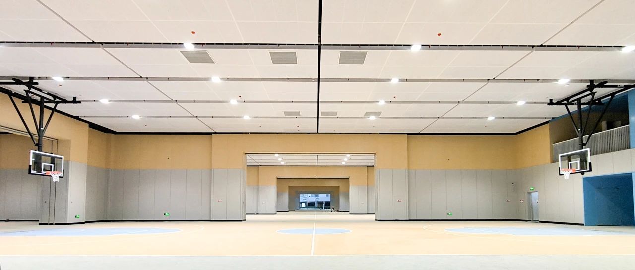足球場底部以“架空層”的形式,共設(shè)有8個標(biāo)準(zhǔn)籃球場,天花板采用白色穿孔吸音鋁板,球場墻面底部為灰色護,墻板上部為木紋紅波吸聲板,休息區(qū)為藍(lán)色鋁板場地色彩活潑明快,空間隔音效果絕佳。