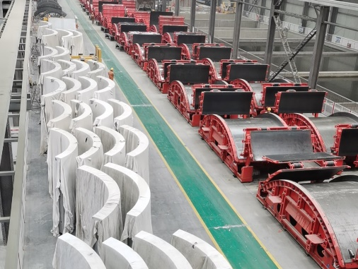 混塔分片式構(gòu)件是將現(xiàn)場(chǎng)作業(yè)搬進(jìn)工廠,生產(chǎn)效率高、質(zhì)量成品效果好、綠色環(huán)保無污染,生產(chǎn)完成后運(yùn)輸?shù)浆F(xiàn)場(chǎng)進(jìn)行快速拼裝,同時(shí)配合使用臥式模具提高精度與效率,實(shí)現(xiàn)模具的迅速轉(zhuǎn)場(chǎng),大大縮短了施工周期。