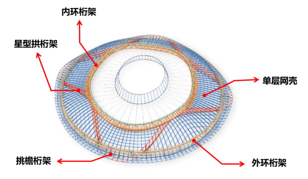 項目屋蓋結(jié)構(gòu)由鋼結(jié)構(gòu)、索膜結(jié)構(gòu)和金屬屋面組成,鋼結(jié)構(gòu)由內(nèi)、外環(huán)桁架、星型拱桁架挑檐桁架等88榀桁架以及單層網(wǎng)殼組成,單榀鋼桁架重約200噸,需要在60米高空完成拼裝焊接,外輪廓平面近似直徑280米的正圓,中心開口平面為長軸176.5米、短軸156.5米的橢圓。
