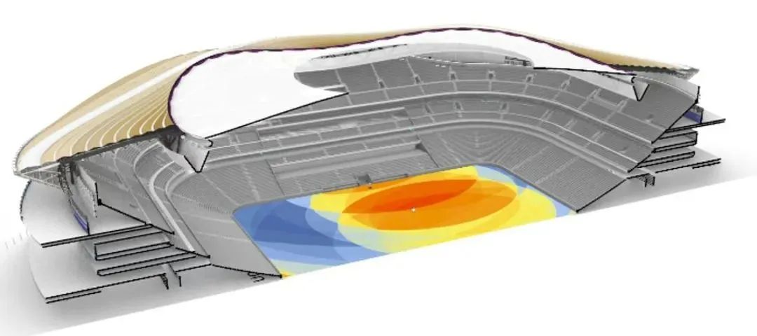 屋蓋鋼結(jié)構(gòu)內(nèi)側(cè)的索、膜結(jié)構(gòu)由CFRP-鋼索組合索桁架和大面積單層PTFE覆膜構(gòu)成,是國內(nèi)首例在專業(yè)足球場大規(guī)模應(yīng)用高透光率PTFE網(wǎng)格膜材料,創(chuàng)新融合了大懸挑屋蓋剛性體系異性索膜柔性體系等諸多大跨空間結(jié)構(gòu)元素,是目前國內(nèi)施工最為復(fù)雜的專業(yè)足球場之一,在兼顧功能、美觀與采光性能的同時,具有“剛?cè)岵?jì)”結(jié)構(gòu)受力特征。