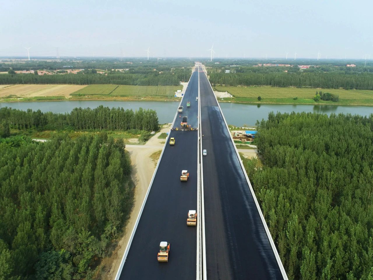 項目路基寬度34.5米,設(shè)計瀝青混合料約37萬噸。施工過程中,項目團(tuán)隊嚴(yán)格落實運輸、攤鋪、碾壓等環(huán)節(jié)的作業(yè)要求,實時監(jiān)測瀝青面層厚度、溫度等關(guān)鍵指標(biāo),采用全斷面防離析瀝青路面攤鋪機(jī),提升路面平整度。通過施工機(jī)械底部鋪設(shè)防滲土工布,上坡道設(shè)置洗車臺等措施,有效防止路面防污染,打造綠色安全、平整寬闊的通衢大道。