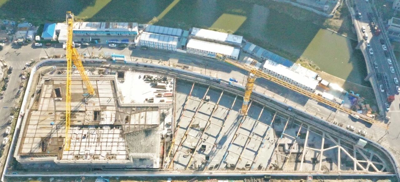 項(xiàng)目應(yīng)用“先撐后拆”施工方法,通過“開挖一段土方、施工一段基礎(chǔ)拆除一段圍護(hù)”的方式,在狹小空間里“靈活作戰(zhàn)”應(yīng)用“鉆孔灌注樁+高壓旋噴樁”減小機(jī)械占用空間,以抬高正負(fù)零標(biāo)高0.5米的方式,使基坑與周邊場地持平,避免雨季內(nèi)澇隱患,保障項(xiàng)目如期封頂。