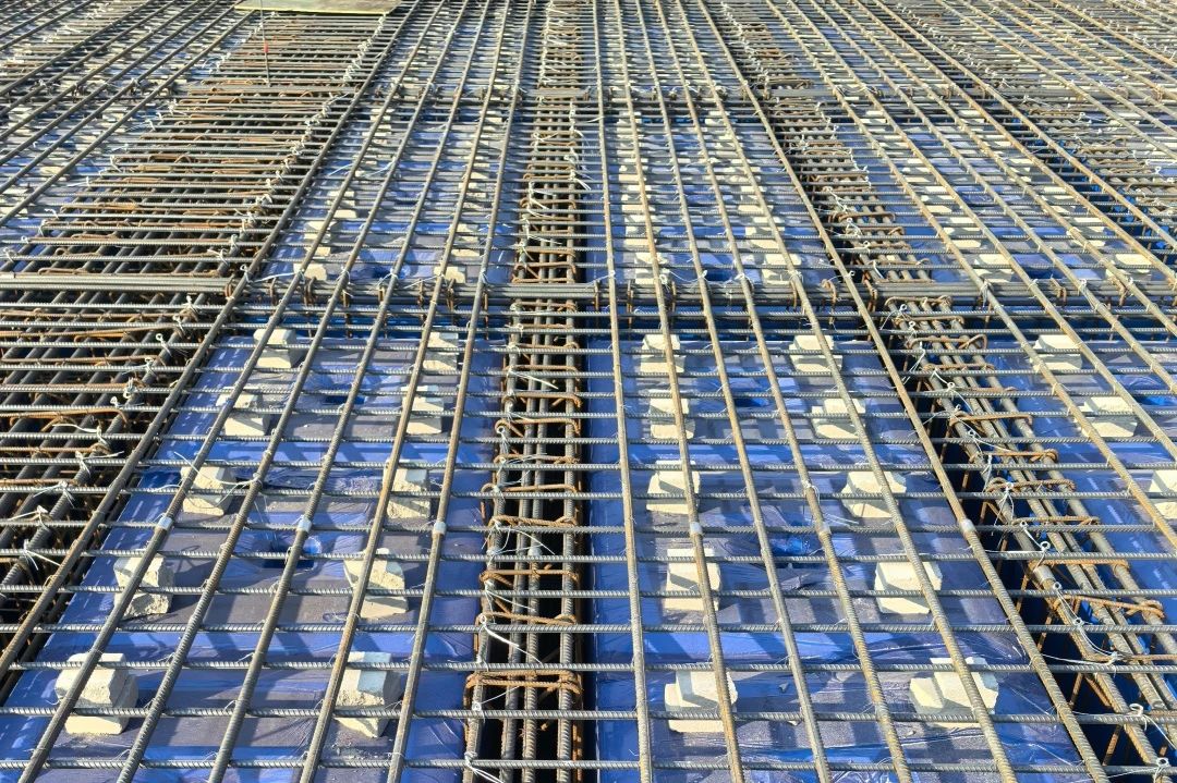 為保證大跨度下結(jié)構強度滿足要求,項目采用LPM預應力空心板技術,有效降低訓練館二層頂板結(jié)構自重,自主研發(fā)新型抗浮施工工藝,將上部鋼筋、肋梁鋼筋、下部鋼筋與空心箱體緊密綁扎形成整體,再于底部模板打出“固定孔”,將上部結(jié)構與下部架體緊密連接,保障了箱體結(jié)構整體穩(wěn)固。