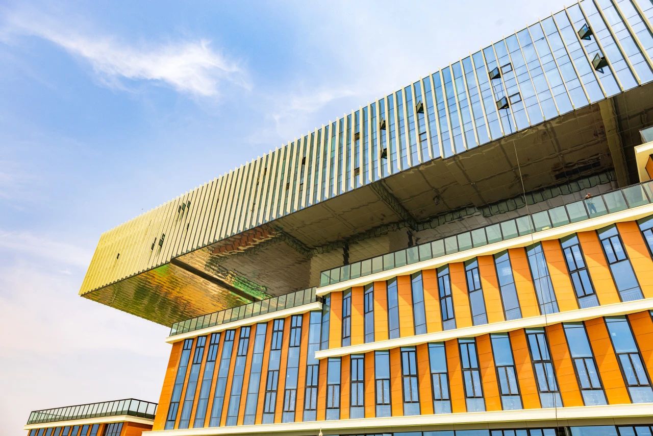 項目由6根立柱式核心筒及大量框架托舉起頂部的“鋼鐵頂冠”,呈現(xiàn)出“平行世界”的設(shè)計理念,其中大噸位、大跨度整體提升鋼連廊最大懸挑44米,整體提升高度30米,是濟南市起步區(qū)首個跨度超90米的高空鋼桁架結(jié)構(gòu)。
