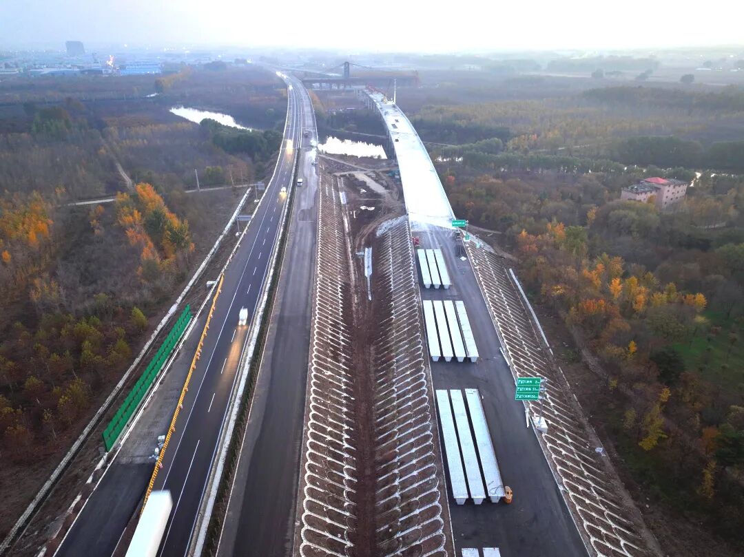 項目途經(jīng)全線唯一特大橋 —— 跨膠濟鐵路特大橋,由于原橋梁部分橫跨植被和河流,原定的雙側(cè)拼寬施工方案空間受限,施工難度大且工程進展緩慢,項目因地制宜采用 “單側(cè)分離新建” 方案,從兩側(cè)各加兩車道變?yōu)橐粋?cè)新增四車道,在大橋北端進行 “路基改橋” 作業(yè)。