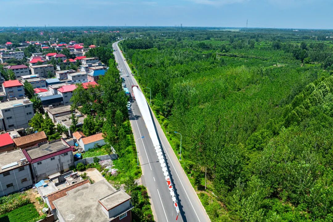 面對(duì) 5000 余個(gè)塔筒管片的生產(chǎn)任務(wù),項(xiàng)目在 60 公里外建立臨時(shí) “衛(wèi)星工廠”,40 天內(nèi)投產(chǎn);通過提前規(guī)劃葉片 “最優(yōu)運(yùn)輸路徑”,新建、改造道路 25.4 公里,讓百米巨大葉片從最遠(yuǎn) 600 公里外順利運(yùn)抵。
