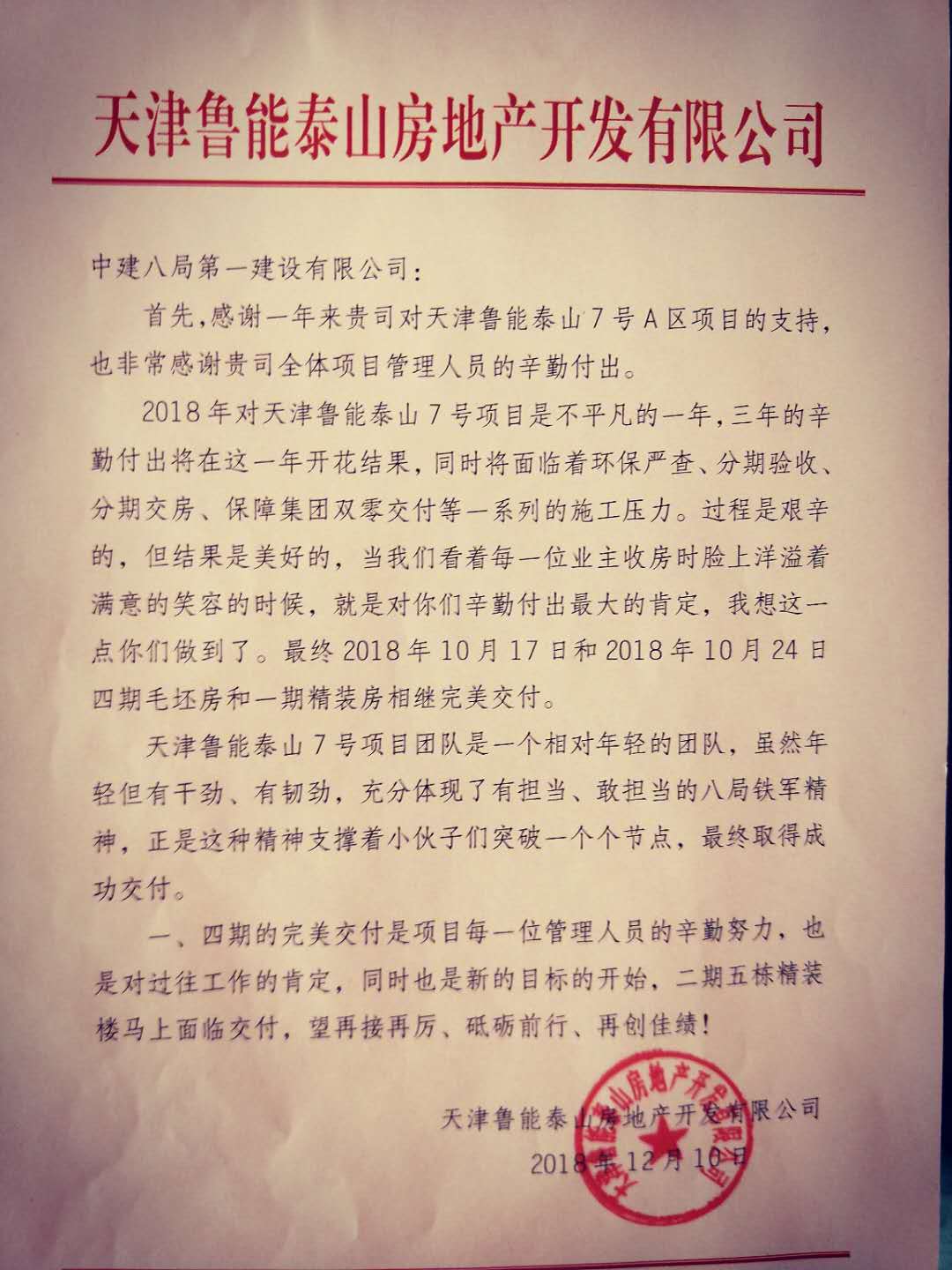 近日天津魯能泰山7號A區(qū)項目喜獲業(yè)主表揚(yáng)信。