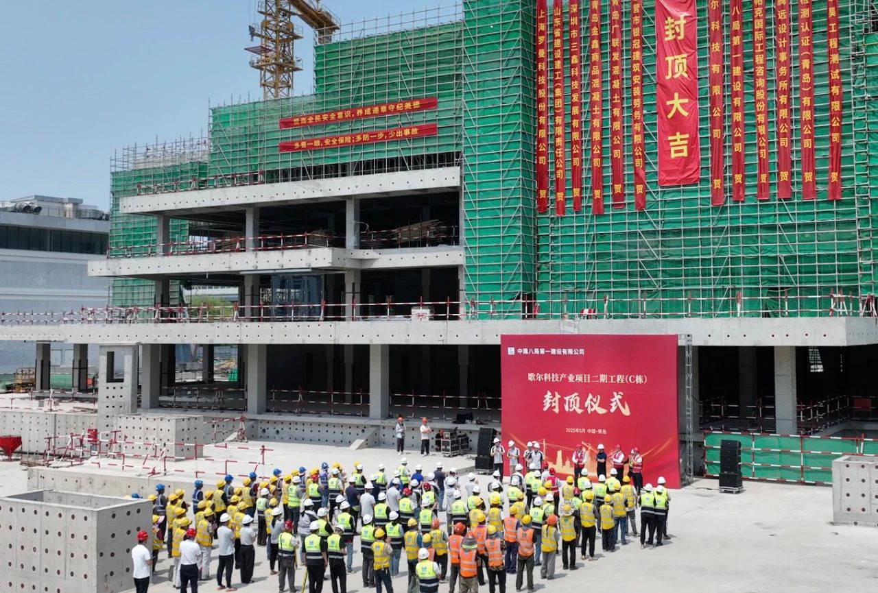 鐵軍團隊筑精品,嶗山之畔奏凱歌。 5月29日,中建八局一公司承建的青島歌爾科技產(chǎn)業(yè)項目二期首棟單體主體結(jié)構(gòu)封頂。