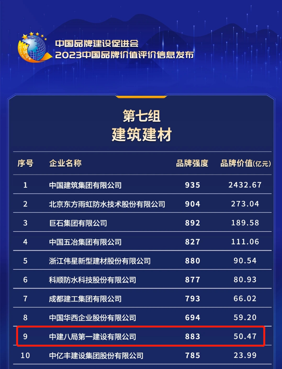 近日,在2023年中國(guó)品牌日活動(dòng)期間,新華社、浙江省人民政府、中國(guó)品牌建設(shè)促進(jìn)會(huì)、中國(guó)資產(chǎn)評(píng)估協(xié)會(huì)等單位聯(lián)合發(fā)布了“2023年中國(guó)品牌價(jià)值評(píng)價(jià)信息”。中建八局一公司以品牌強(qiáng)度883、品牌價(jià)值50.47億元位列建筑建材行業(yè)第9位。