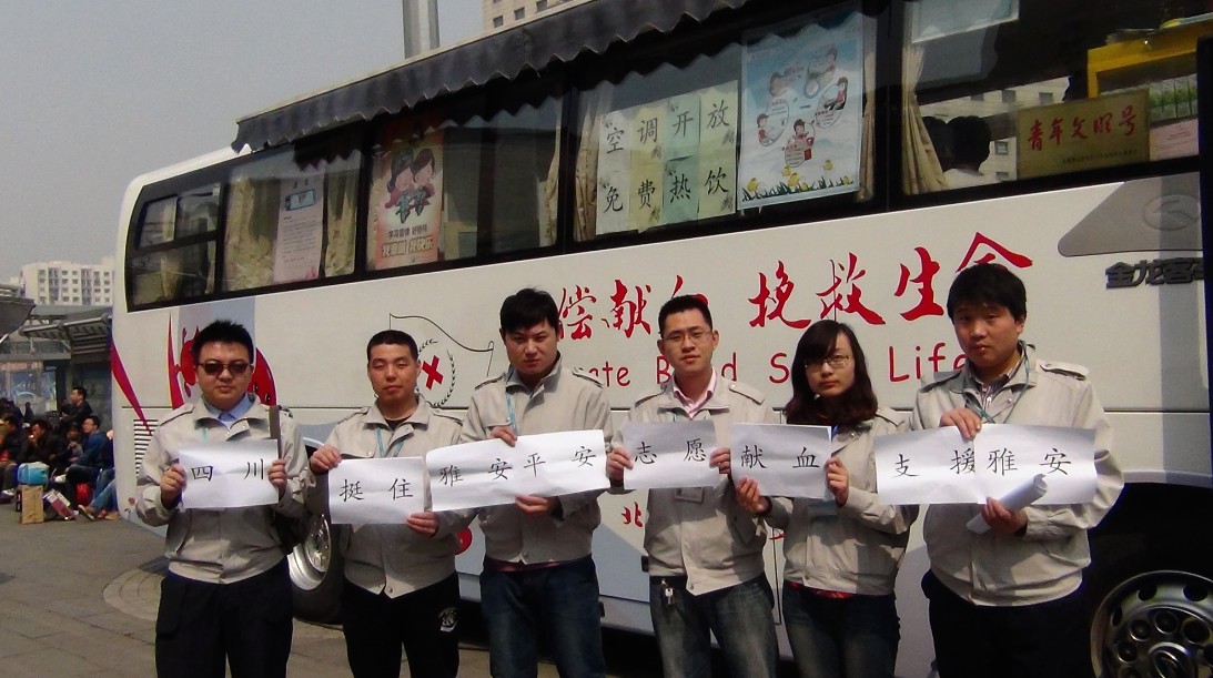 四川雅安地震發(fā)生后,當(dāng)?shù)氐氖転?zāi)情況一直牽動著一公司廣大職工的心。4月21日早上,在得知雅安血庫告急,需要支援的消息后,一公司北京華電項(xiàng)目黨支部自發(fā)組織“四川加油,雅安平安,志愿獻(xiàn)血,支援雅安”的獻(xiàn)血活動,項(xiàng)目職工薛燕軍、許瑩瑩、李作棟、王金貴、孔慶俊在項(xiàng)目黨支部書記西濤的帶領(lǐng)下來到北京西站無償獻(xiàn)血點(diǎn)獻(xiàn)血,用實(shí)際行動支援雅安。(西濤)