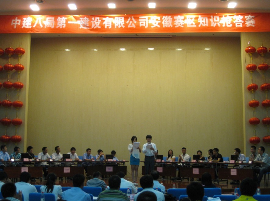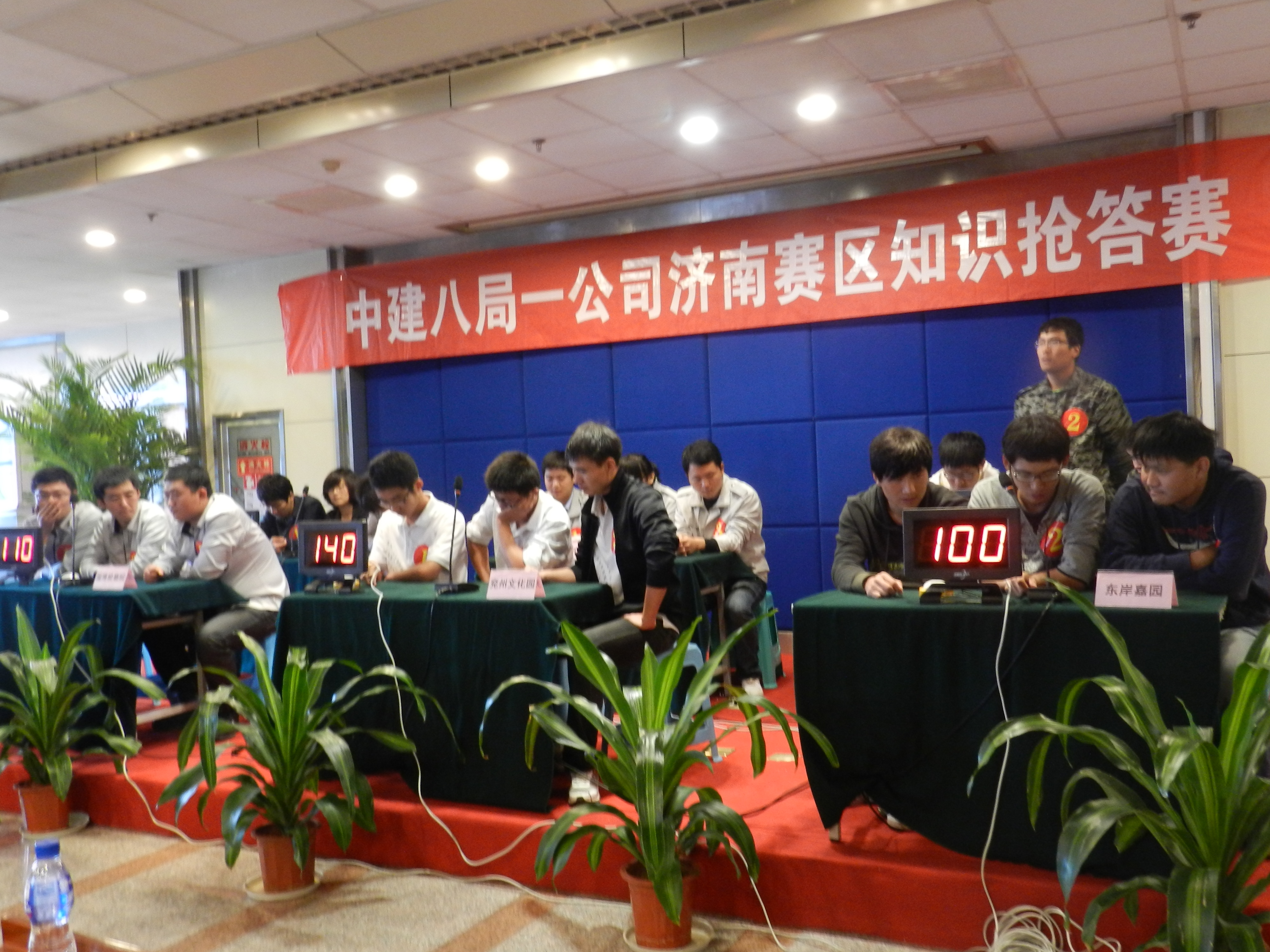 青島分公司、上海分公司、廣東分公司于9月3號率先開賽,北京分公司、河南分公司、安徽分公司、濟南分公司于9月17號同時開賽,各單位領導高度重視,廣東分公司經(jīng)理、書記均出席了此次活動、北京分公司項目經(jīng)理均到現(xiàn)場為自己的隊員加油鼓勁,所有參賽隊員及觀眾均統(tǒng)一著裝,體現(xiàn)了對此次活動的重視程度。河南公司制作的知識搶答賽預告片給人耳目一新的感覺;廣東賽區(qū)廣東分公司機關代表隊在風險題環(huán)節(jié)不敵水榭春天代表隊,錯失冠軍;濟南賽區(qū)濟南公安局項目代表隊遙遙領先、兗州文化園項目代表隊緊追其后;北京賽區(qū)天津中船重工項目代表隊和天津檢疫局代表隊展開了激烈爭奪。安裝分公司、裝飾分公司、基礎設施分公司書記也根據(jù)情況出席了分片區(qū)比賽現(xiàn)場?;顒咏M委會從各單位準備情況、項目參賽率、錯題率、犯規(guī)情況、觀眾人數(shù)、主持人主持情況、書面答題等各個方面對各賽區(qū)組織工作進行了綜合考評。