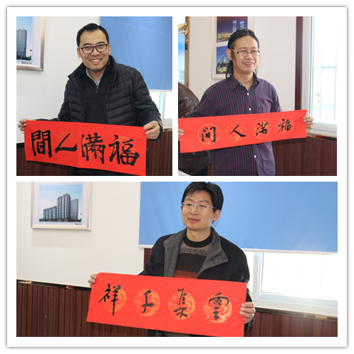 1月14日,公司濟(jì)南中央商務(wù)區(qū)安置區(qū)(CBD)項目熱鬧非凡。山東省青年書協(xié)常務(wù)副主席李成軍,省青年書協(xié)副主席兼秘書長黨現(xiàn)強(qiáng),省青年書協(xié)副秘書長、山東財經(jīng)大學(xué)副教授王子庸,省青年書協(xié)理事、市青年書協(xié)副主席王奇嵩四位書法家及公司書法協(xié)會成員徐偉、吳天均、張廣超,現(xiàn)場揮毫,一刻不得閑,一條條寫有新春祝福的對聯(lián),散發(fā)著清新墨香,一張張桌子前人頭攢動。
