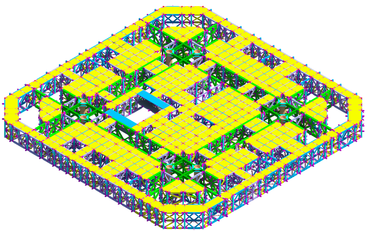 項目因此計劃研發(fā)智能化整體提升平臺施工。該頂升平臺能夠?qū)崿F(xiàn)施工集成,將施工電梯直達平臺、卸料平臺、混凝土布料溜管、臨時設施、物料堆場等與平臺的融合,優(yōu)化資源配置,減少設備之間運行的干擾,提升施工速度;利用墻體預埋鋼盒,油缸支撐系統(tǒng)附著墻體,保證平臺承載力,同時可抵御高空風荷載作用。通過優(yōu)化設計,外掛架開合伸縮機構,解決墻體內(nèi)收、傾斜、伸臂桁架、預埋附墻件等復雜情況下的平臺爬升;全方位實時監(jiān)控平臺工作運行狀態(tài),具有預警功能。