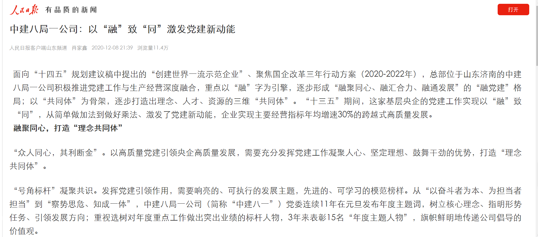 12月8日,《人民日報(bào)》客戶端以《中建八局一公司:以“融”致“同”激發(fā)黨建新動(dòng)能》為題,全文刊發(fā)公司“融黨建”工作的經(jīng)驗(yàn)做法,瀏覽量很快突破10萬+。
